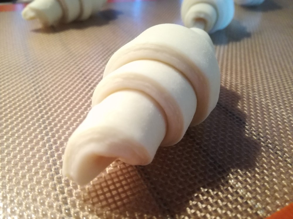 - On étire la pointe de chaque triangle, on incise sur 2 – 3 cm la base et on roule depuis la base: On gardera la pointe en bas qu’on posera les croissants ainsi façonnées sur la plaque de cuisson (muni d’un papier sulfurisé ou d’un tapis de cuisson).
