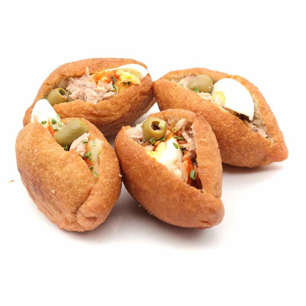 - Garniture : Une fois nos beignet refroidi, on fait une ouverture sur le haut quasiment sur la moitié (on ne coupe pas en entier), façon sandwich. On commence par une cuillère de purée de pomme de terre, une petit cuillère d’harissa à l’eau ne fera pas de mal. On ajoute au choix : thon, 1/4 d’oeuf dur, olives, capres. Et on termine avec une cuillère d’harissa à l’eau.