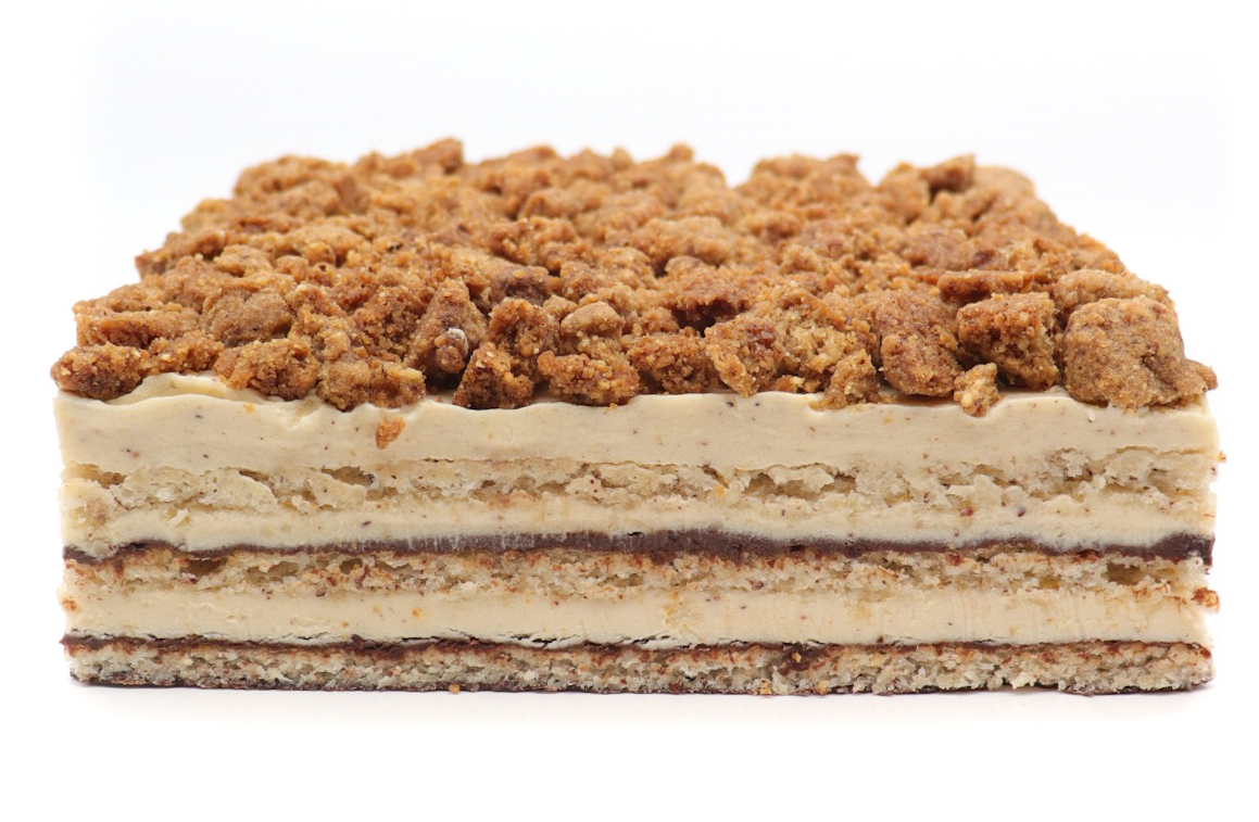 Ici la noisette est mise à l’honneur du biscuit, à la crème au croquant. Pour le croquant, j’ai opté pour un streusel noisettes, une tuerie, mise au dessus du gâteau pour changer comme décoration.