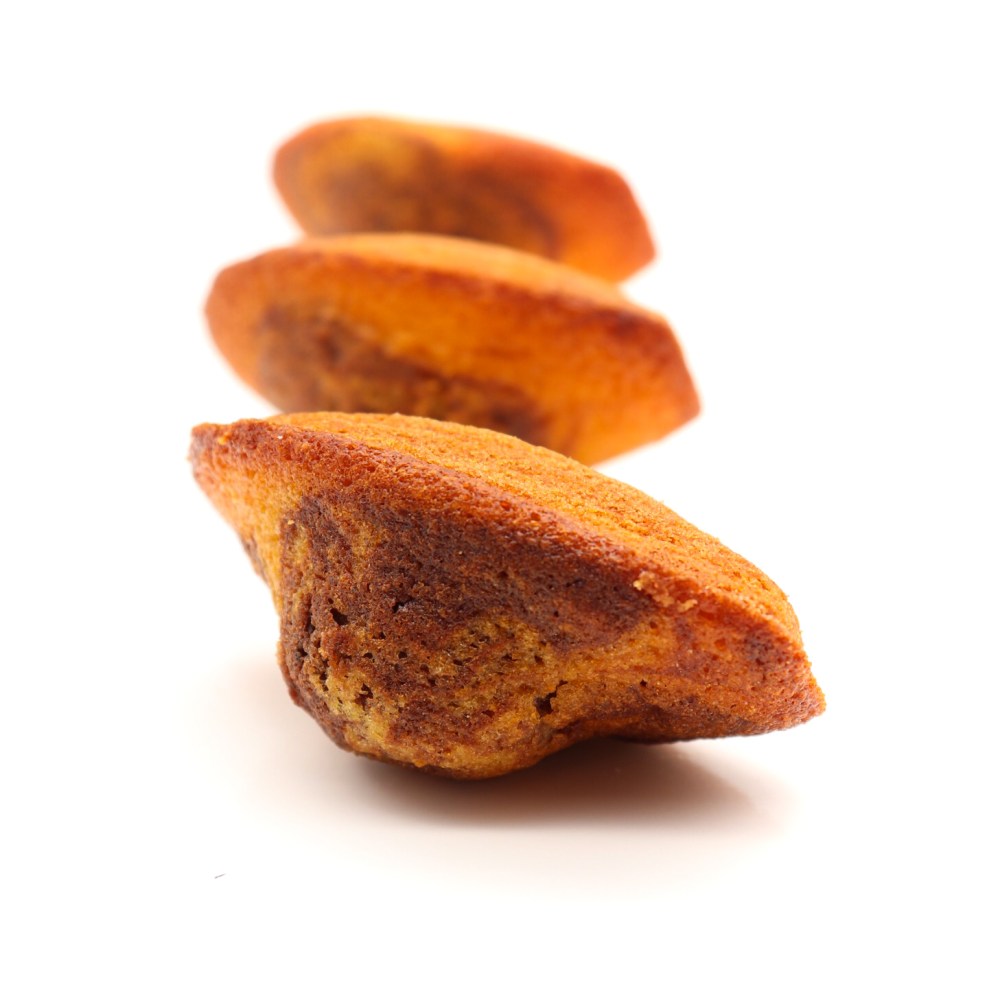 - Un peu de calcul : avec le moule que j’utilise, j’ai du ajuster les quantité pour avoir de belle madeleine ni trop petite ni qui s’étale trop à la cuisson ce qui aide aussi à avoir une belle bosse. J’utilise 19 g de pâte à madeleine au total donc a peu près 13 g d’appareil orange et 6 g d’appareil cacao.