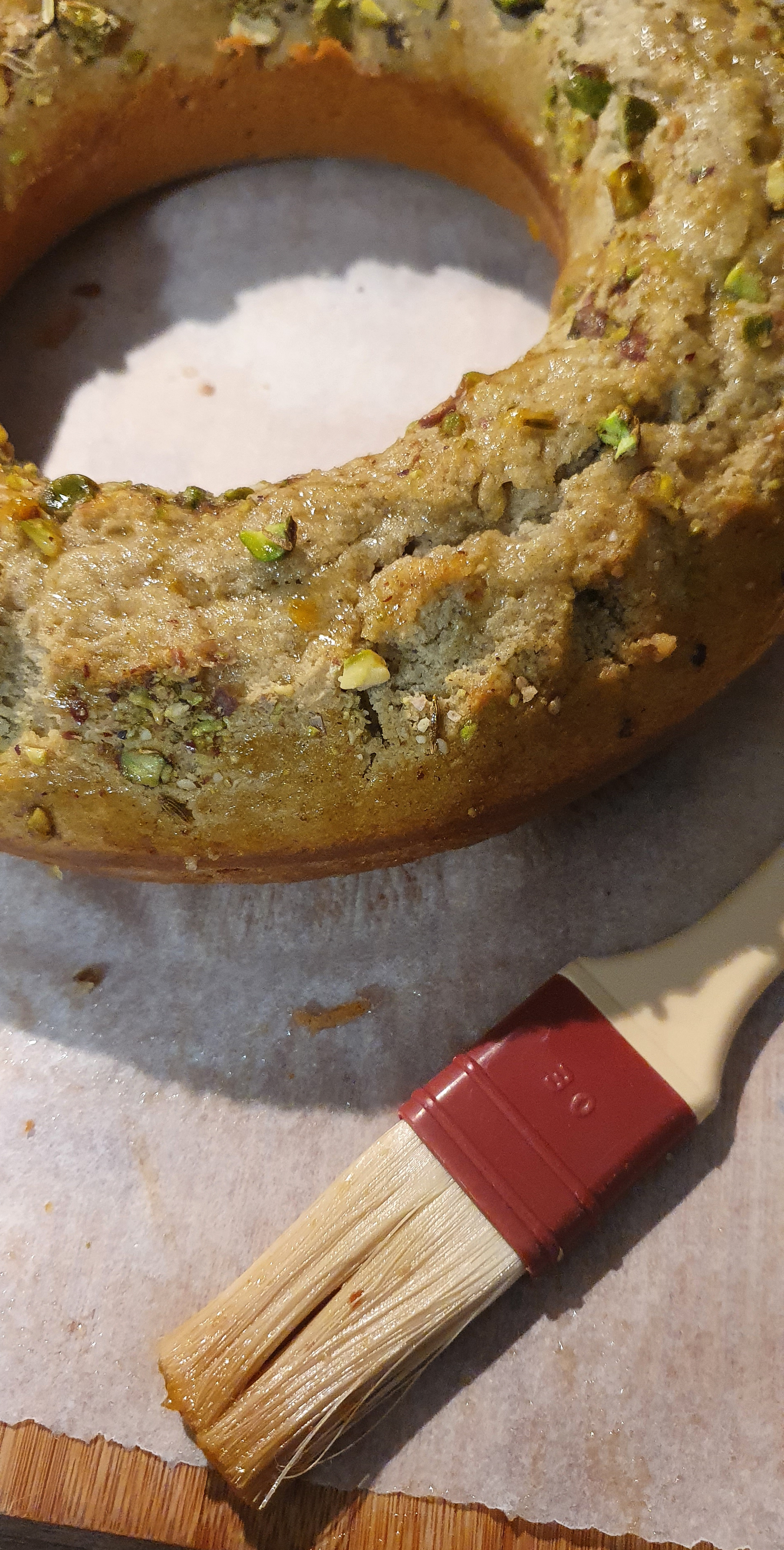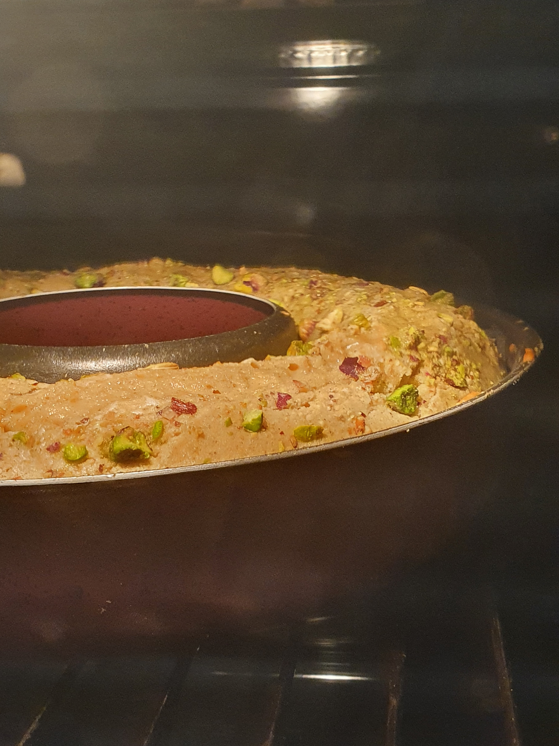 J’ai abandonné ici mon moule à cake classique pour un moule à savarin que je trouve plus adapté.