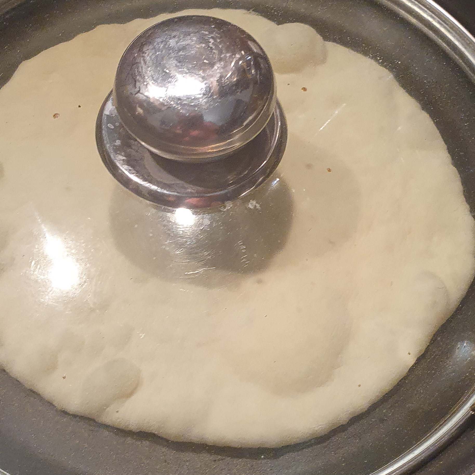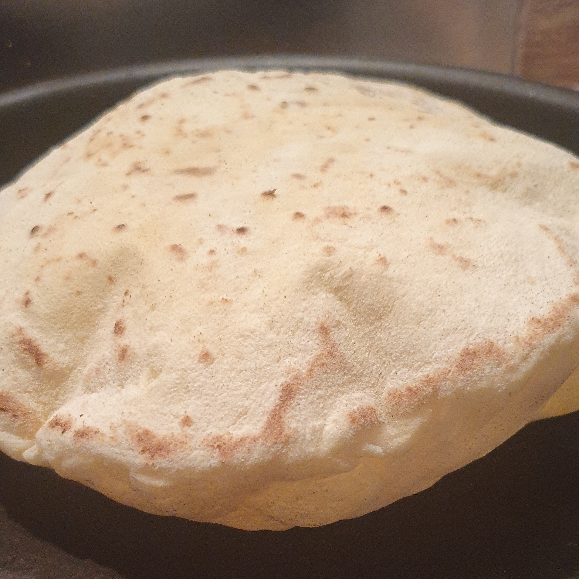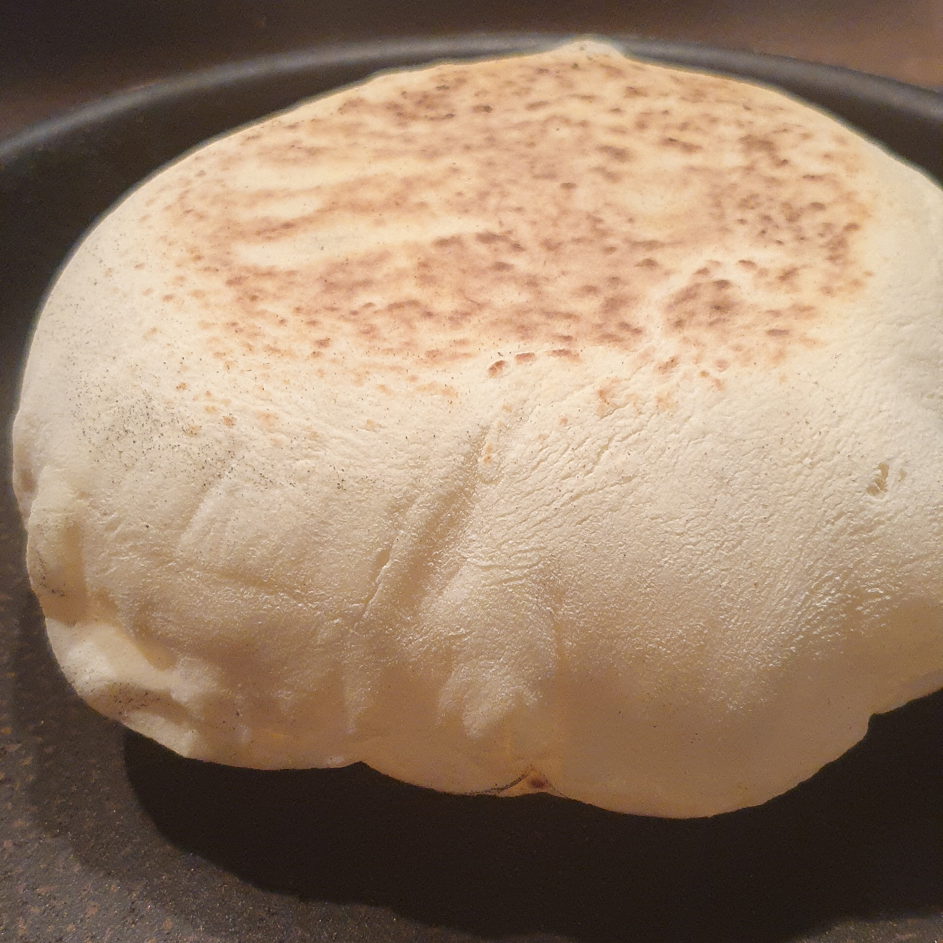 - La cuisson: On chauffe la poêle. On pose le Naan dessus et on couvre. Dès qu’on voit des petites bulle apparaitre on le tourne 1 fois on laisse quelques seconde et on retourne une deuxième fois. Le Naan devrait commencer à gonfler. Si besoin on appuie légèrement sur la partie qui gonfle pour distribuer l’air dans tout le Naan.