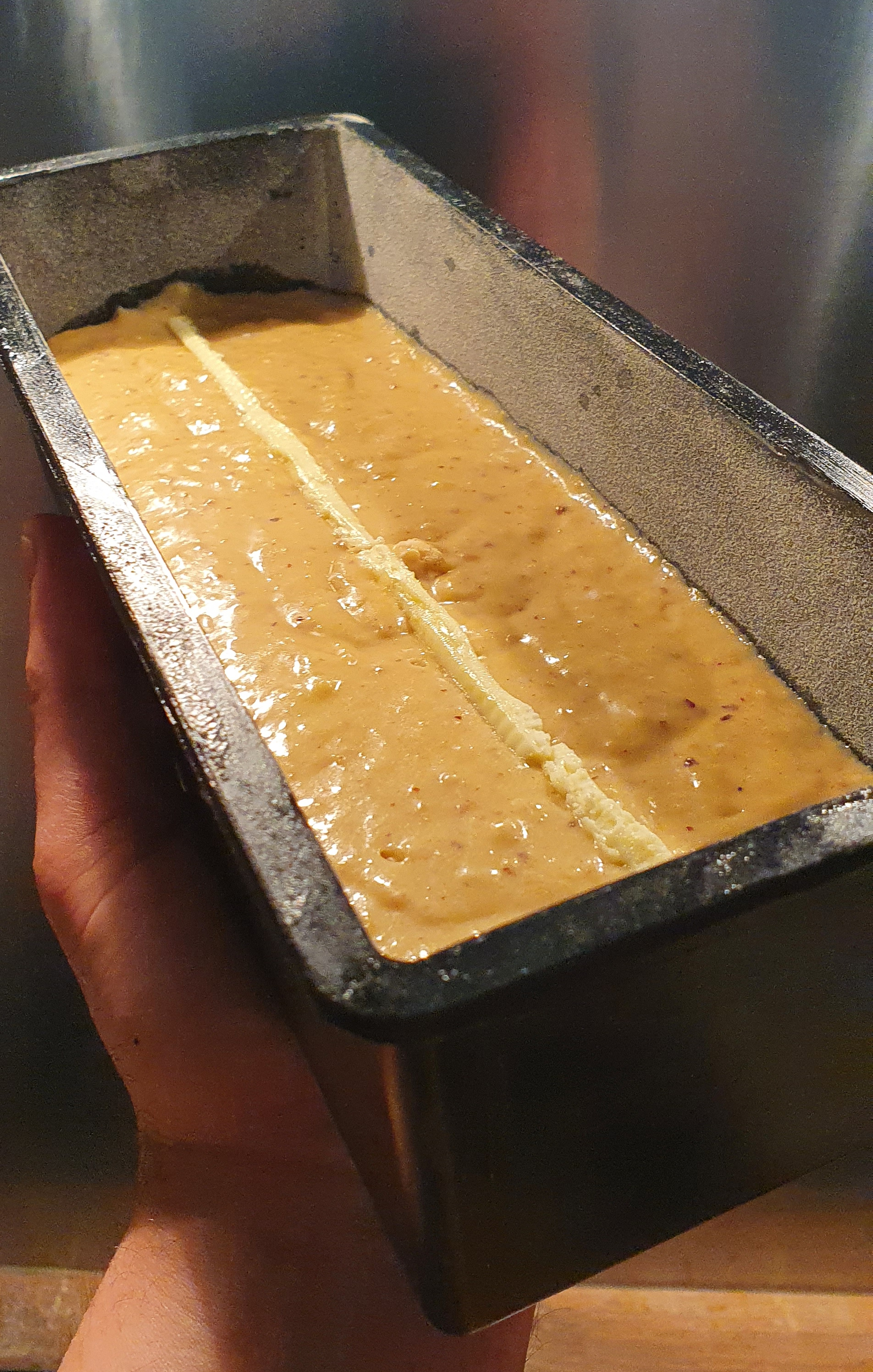 - On poche un filet de beurre pommade au centre et le long du cake (ou pour les fainéant comme moi juste couper des bout de beurre de largeur 2ou 3 mm et les poser le long du cake). Cela servira à avoir un cake qui s’ouvre au milieu à la cuisson et se développe de manière uniforme.