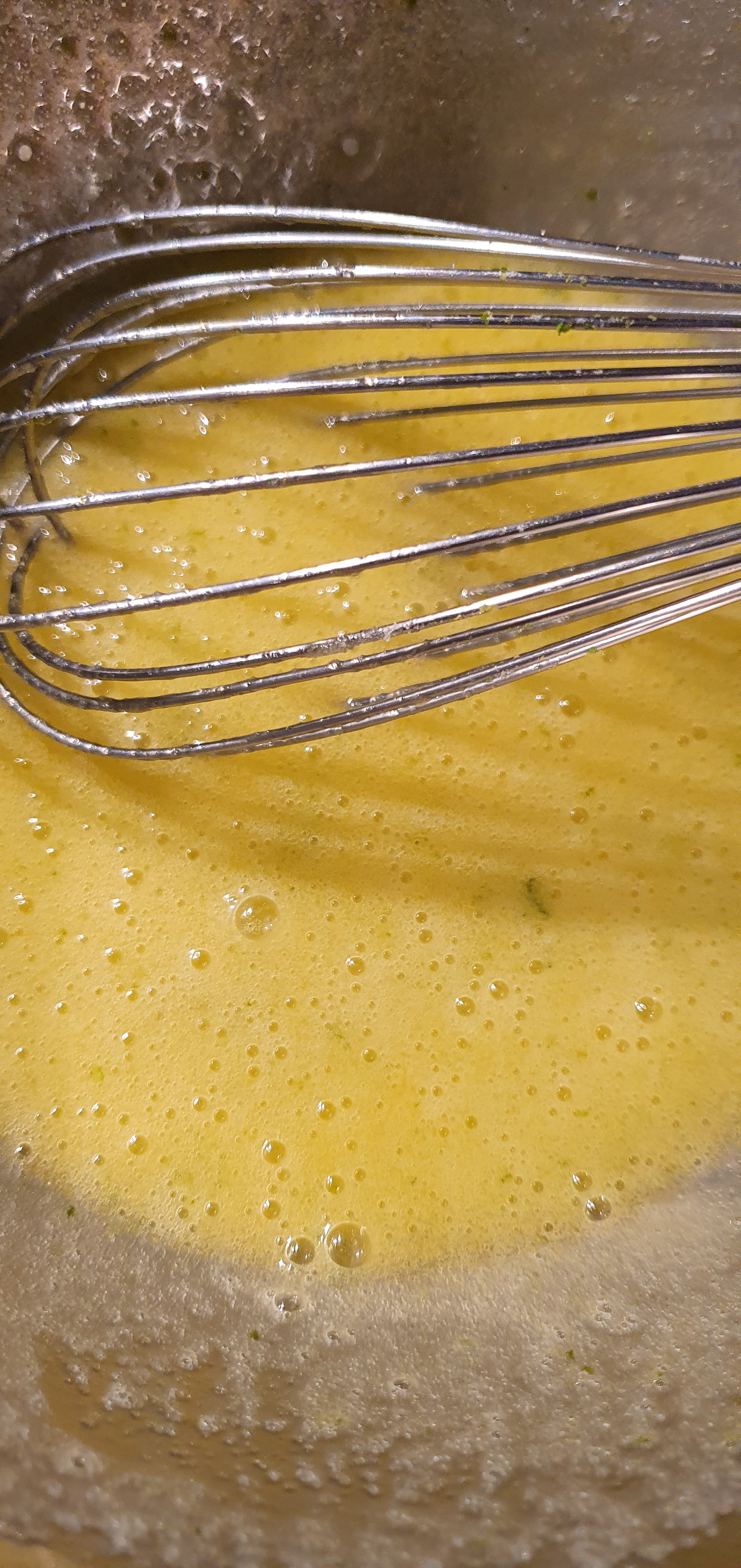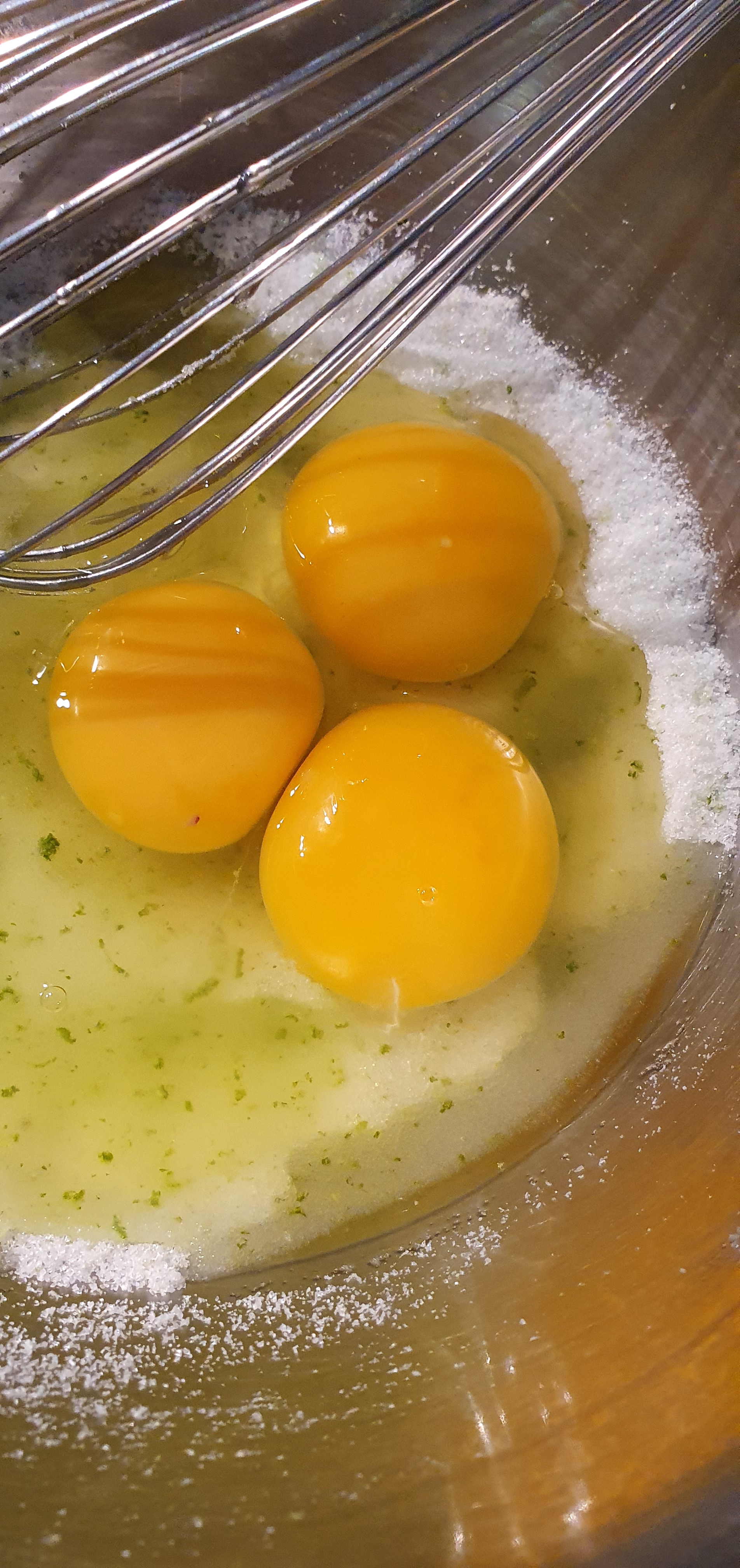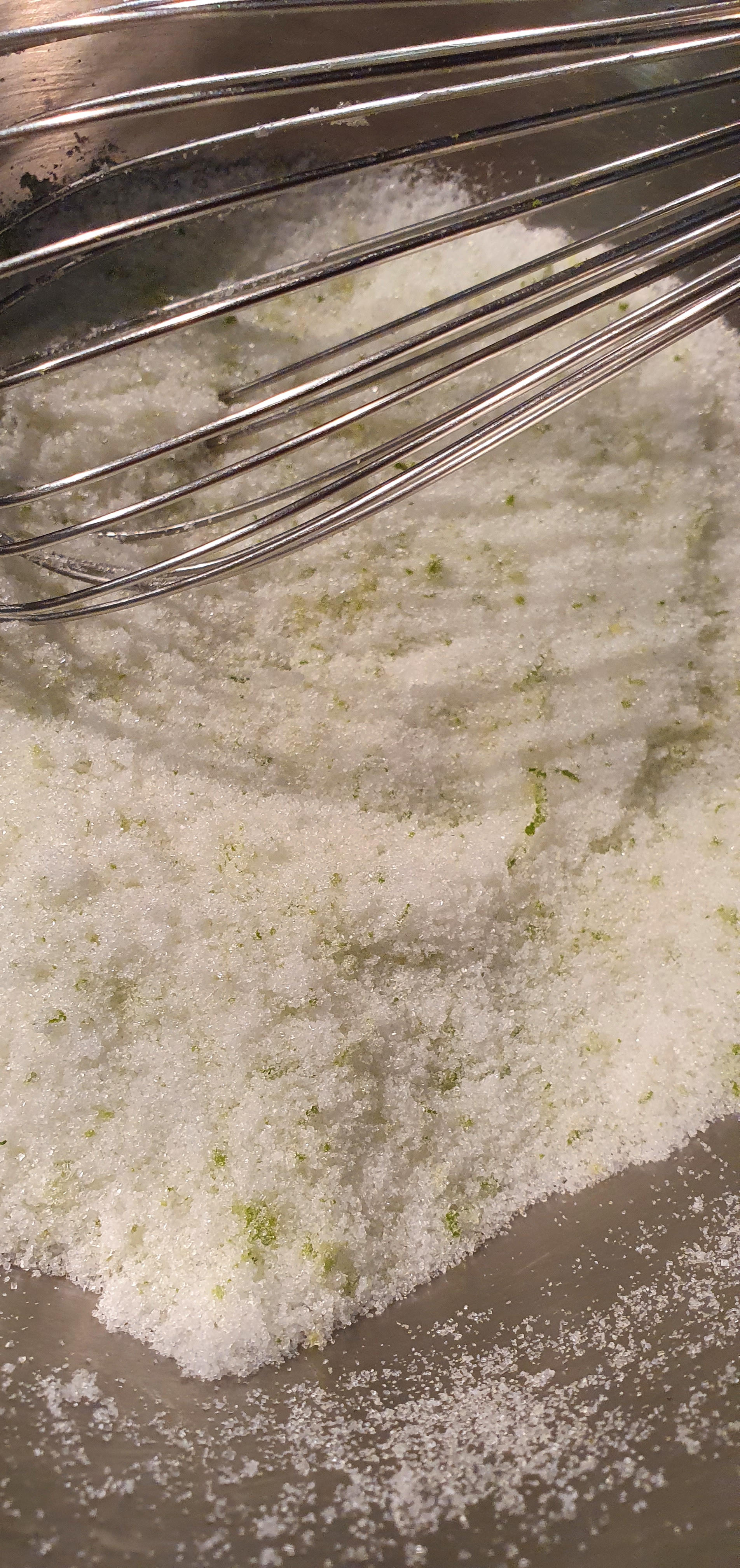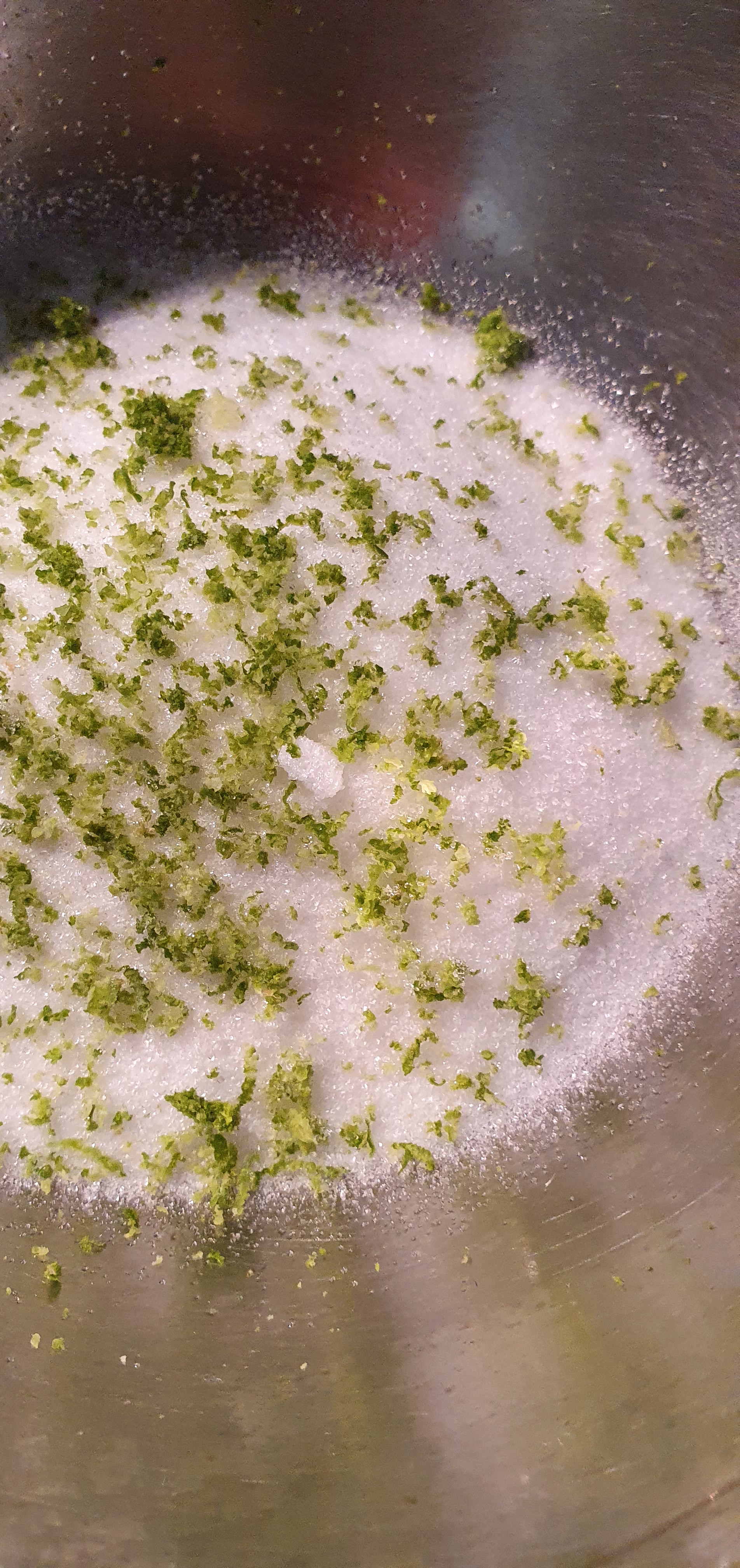 - On mélange les zestes de citrons vert au sucre et on mélange au fouet: cela va parfumer le sucre et parfumera encore mieux le cake.