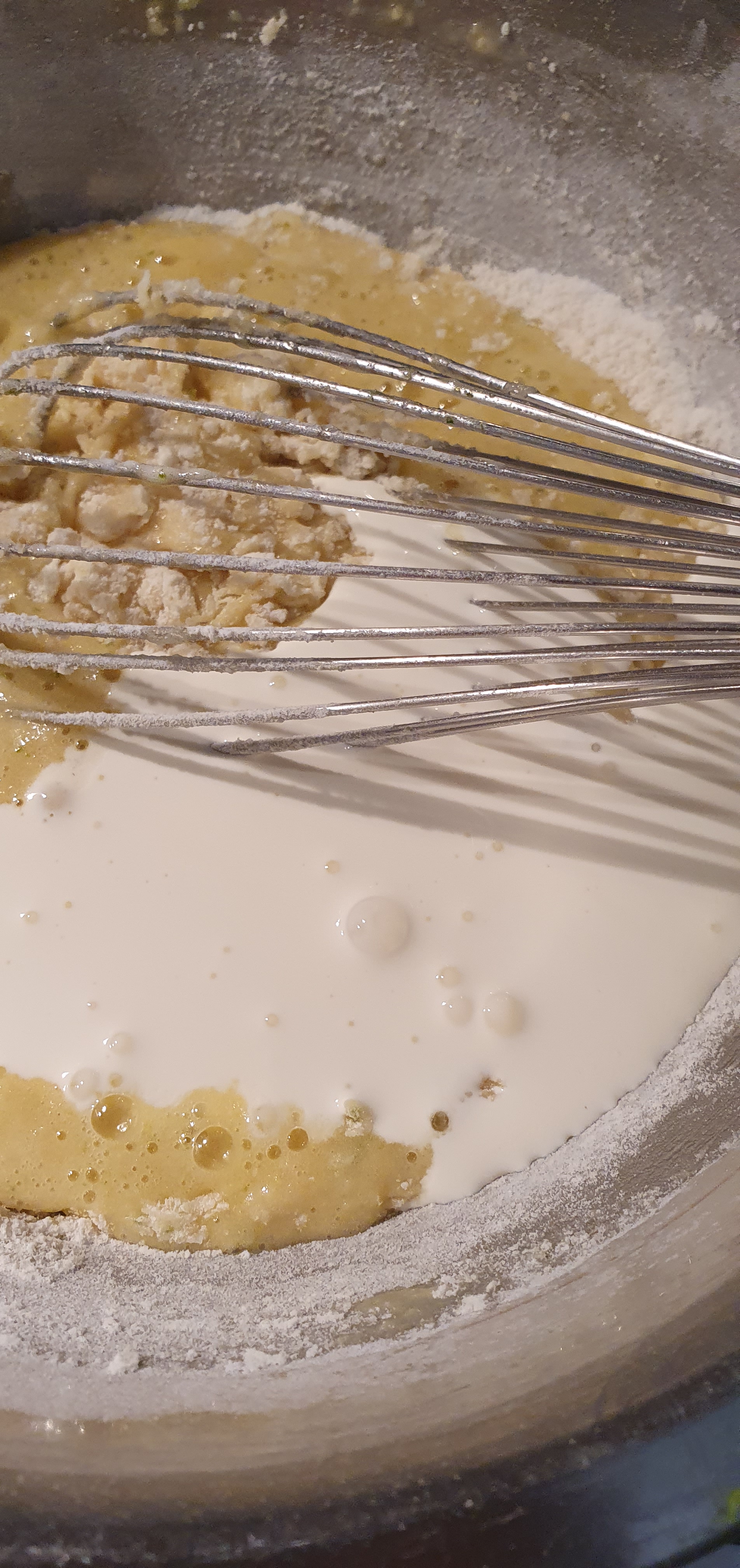- On ajoute la farine et la levure chimique tamisé ensemble, et on lisse le mélange.