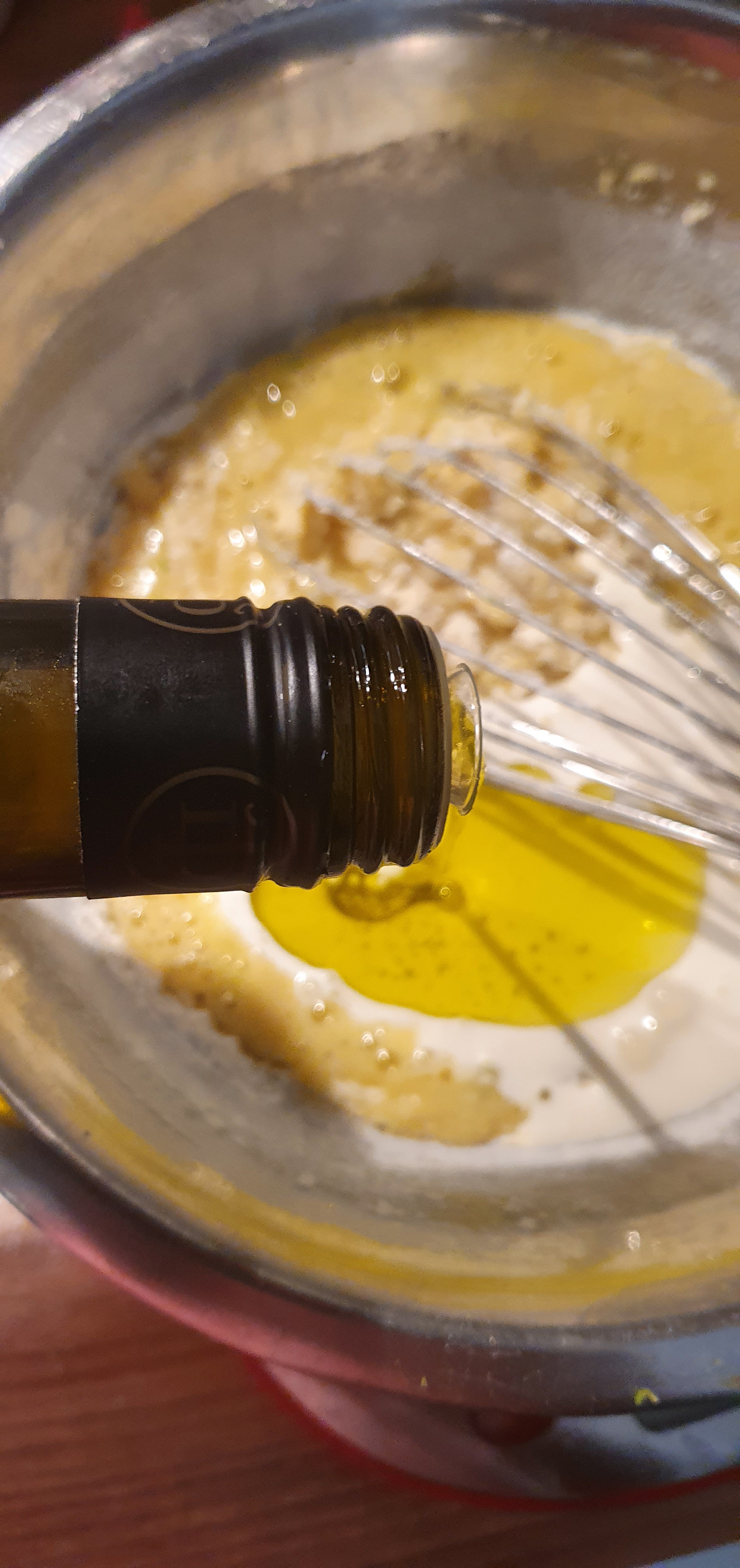 - On ajoute l’huile d’olive à l’appareil à cake, et on lisse le mélange.