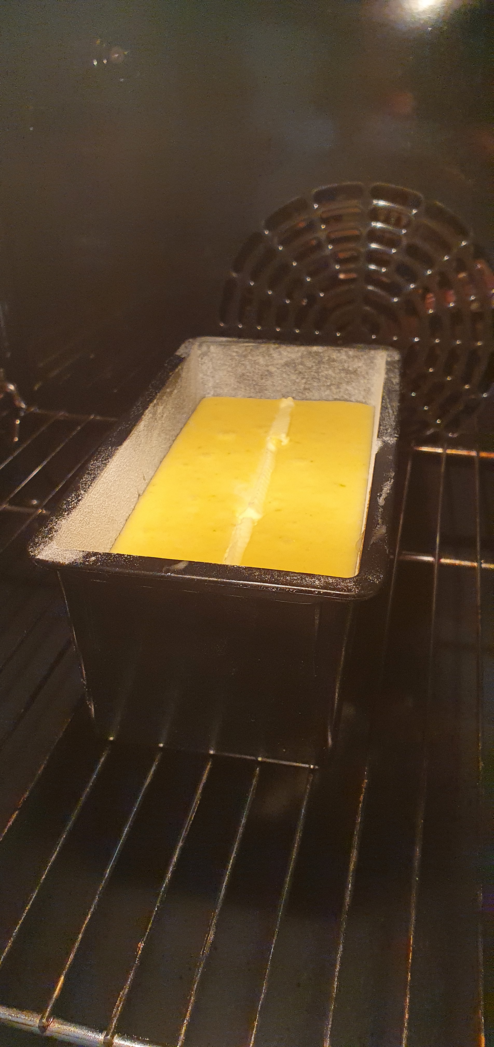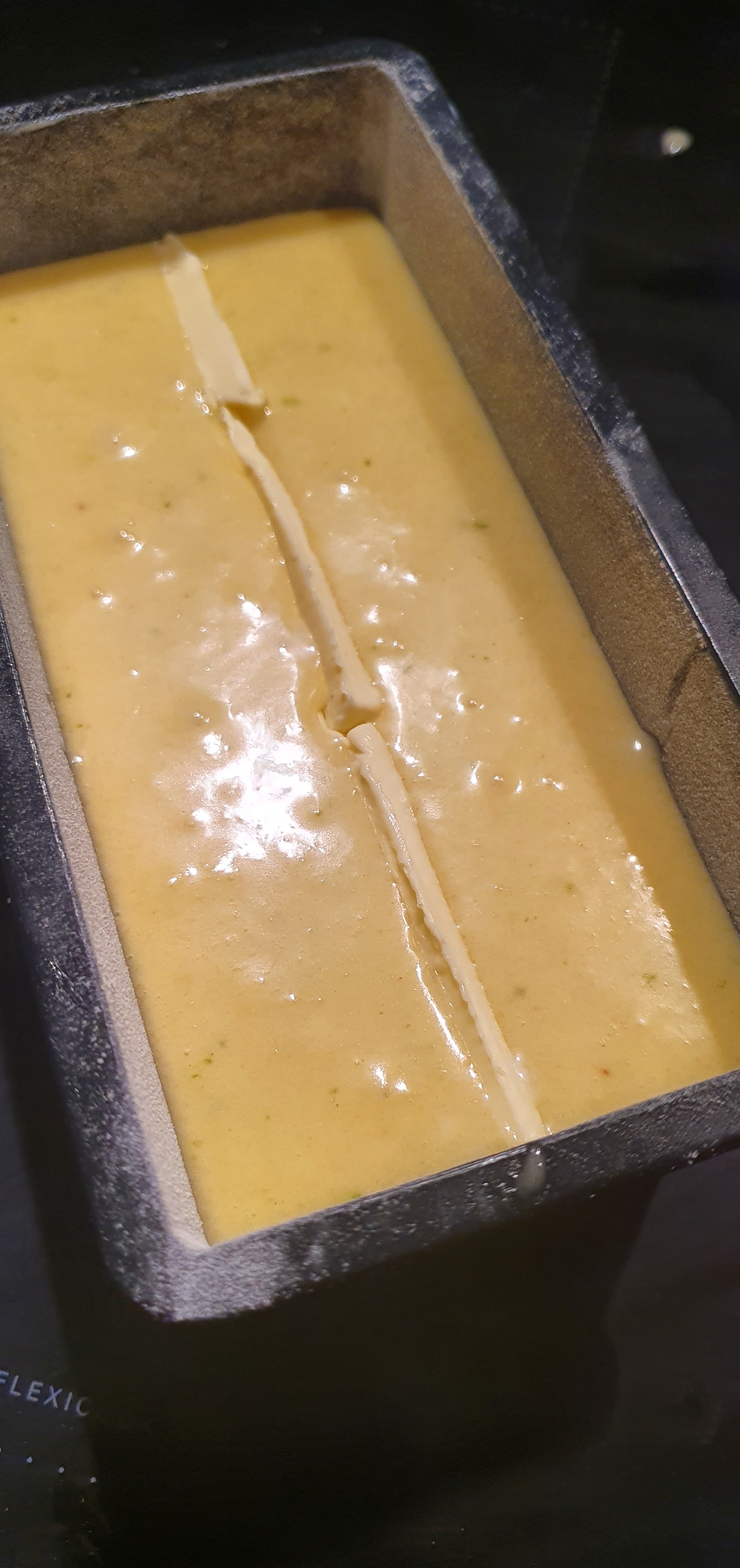 - Dans un moule préalablement beurré et fariné ou chemisé de papier cuisson, on verse l’appareil à cake. Pour avoir un cake qui développe une belle bosse bien régulière on peut pocher sur toute la longueur un filet de beurre pommade ( ou si vous êtes fainéant comme moi, simple couper des morceau de beurre de 2 ou 3 ml de largeur et les déposer sur la longueur du cake).