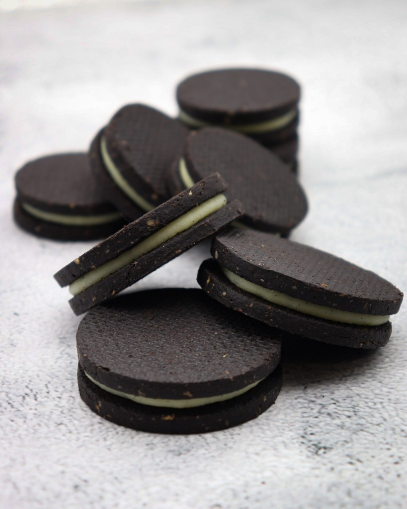 - Une fois les biscuits refroidies, on remplie une poche à douille de ganache (on la détends un peu au fouet si elle trop prise), et on garnie les biscuits, comme des macarons, avec une noisette de ganache au milieu.
