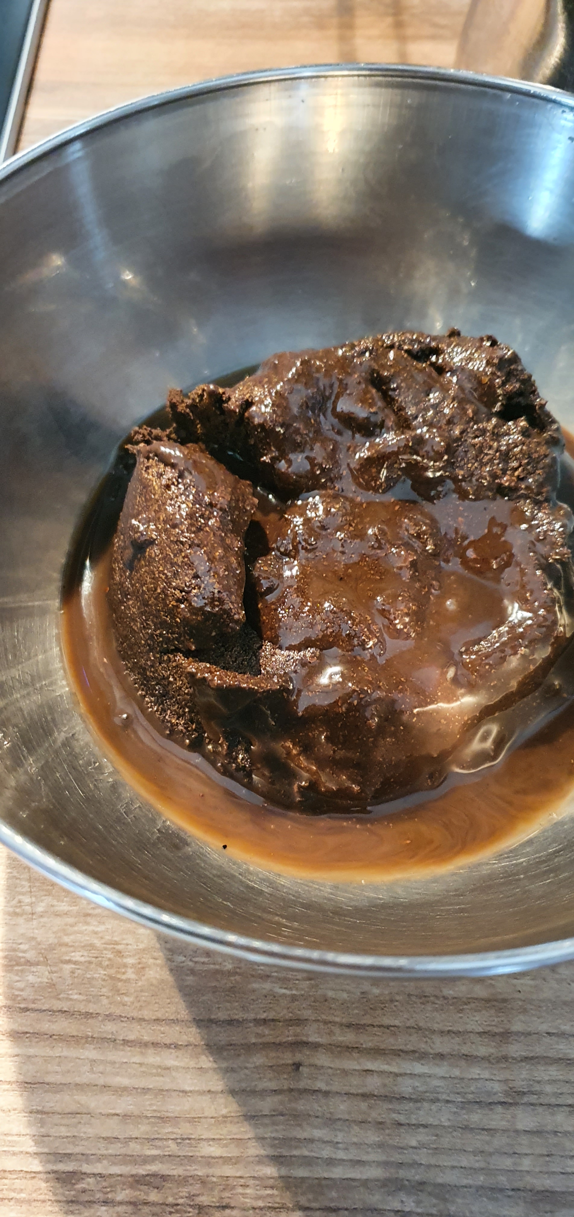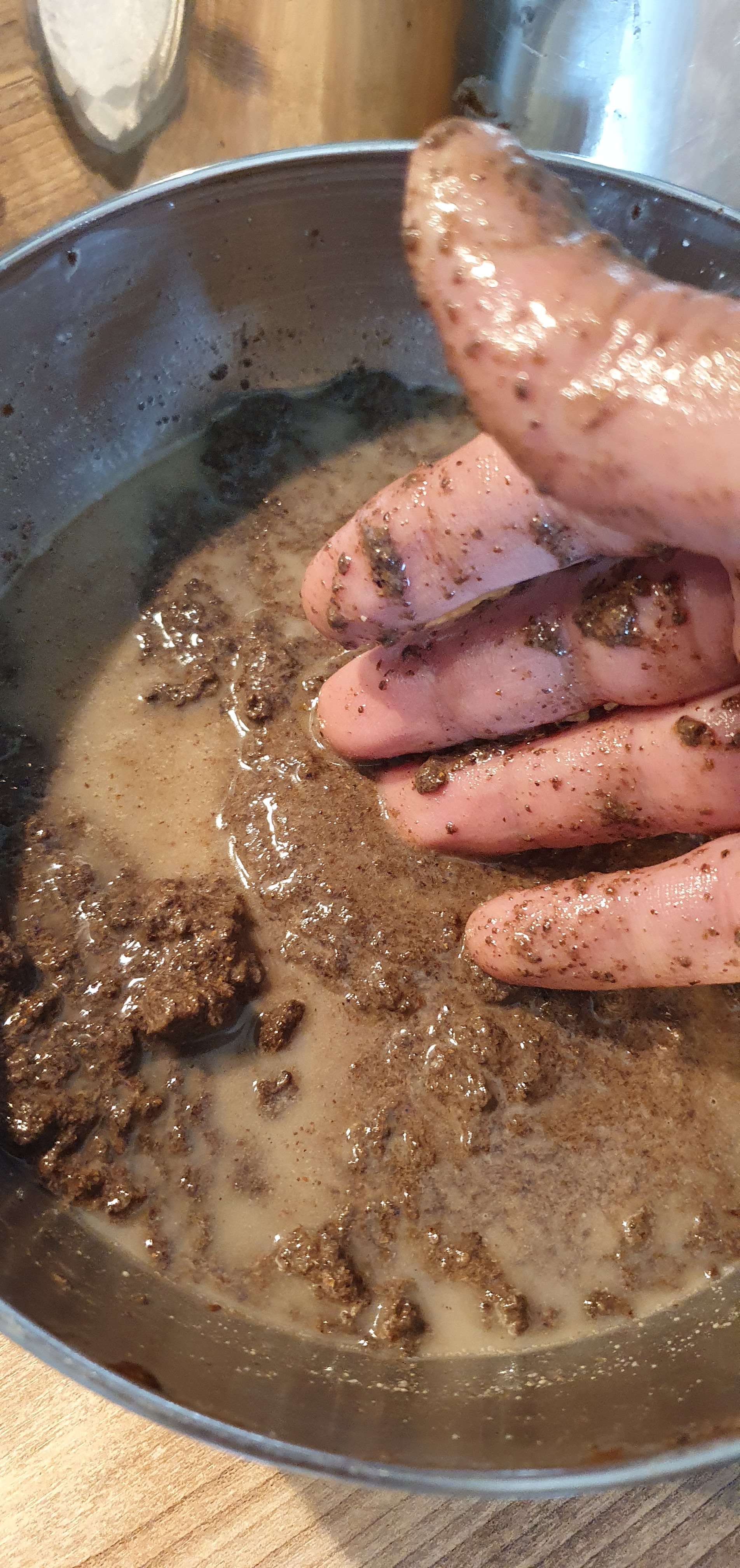 - On mélange avec les mains on malaxant jusqu’à avoir un mélange assez épais mais homogène qu’on laisse reposer 10 ou 15 min.