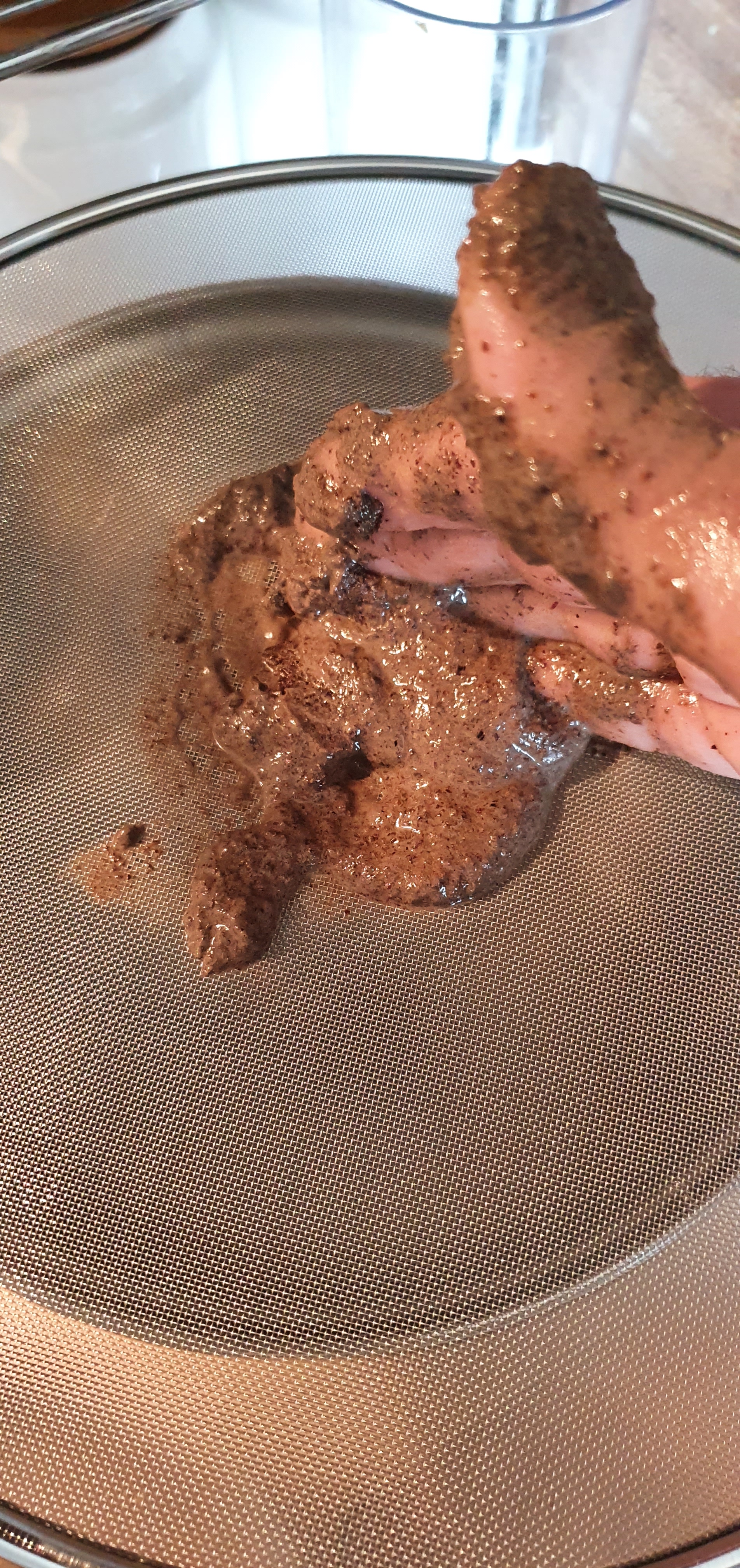 - On passe le mélange petit à petit à travers un tamis très fin: l’objectif est d’extraire le maximum de suc sans faire faire passer les bout de la coque extérieure des graines. On réserve les reste de côté.