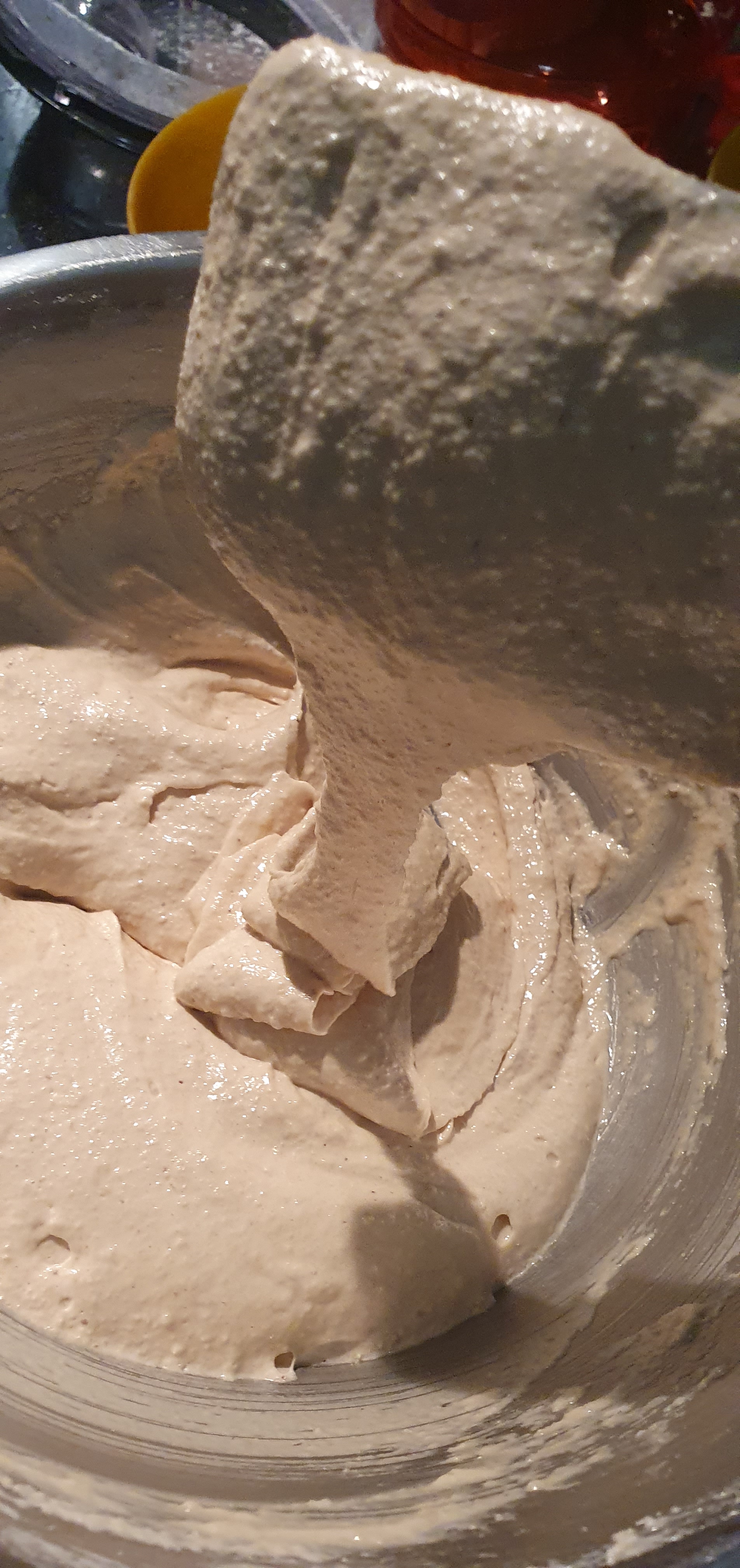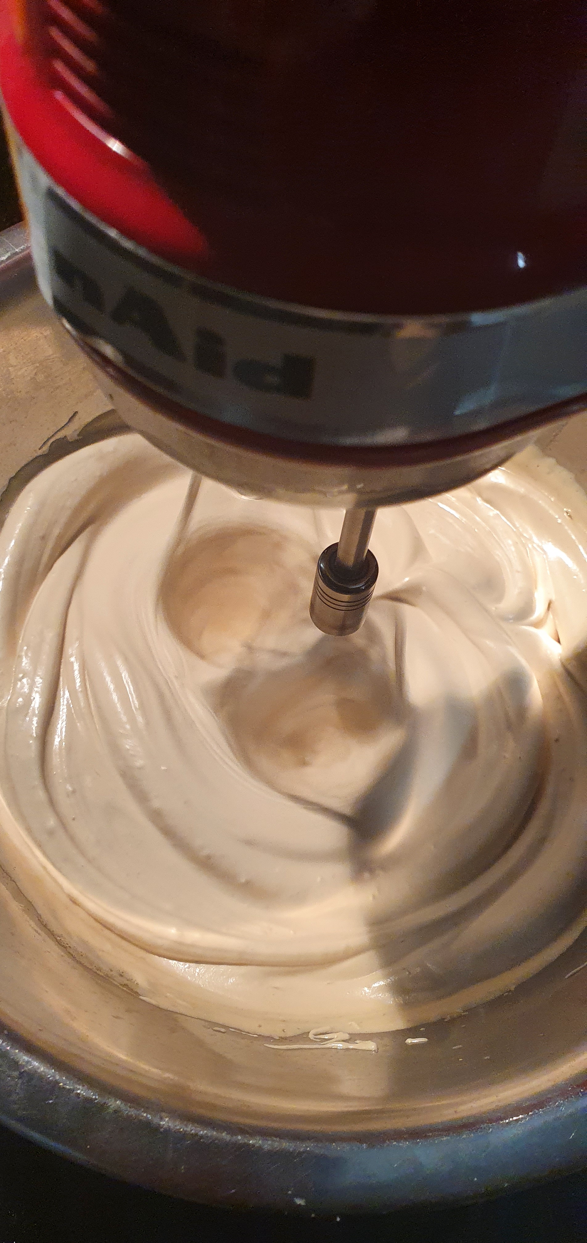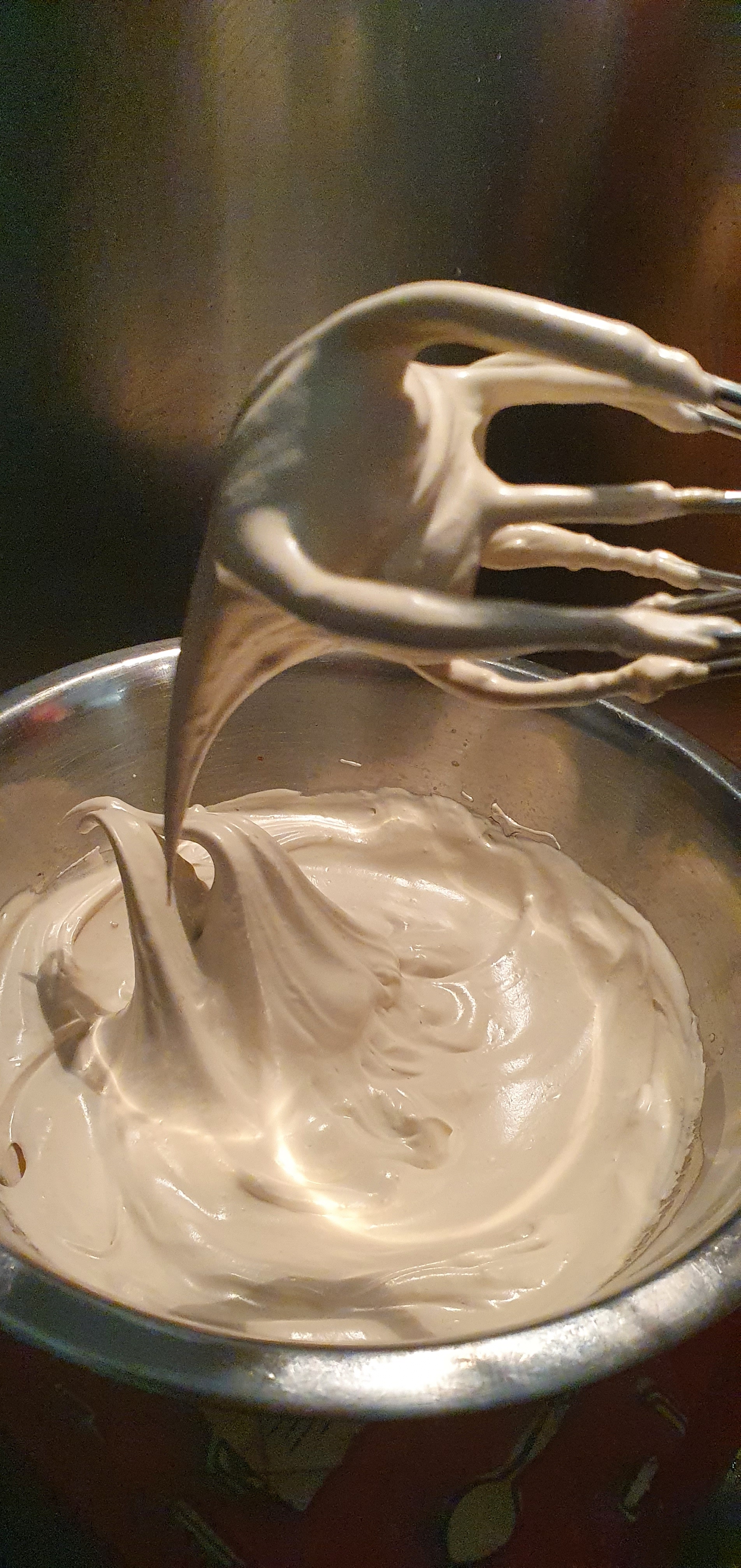 - On monte au robot à faible vitesse 55 g de blanc d’œuf (ceux on a mis le café)