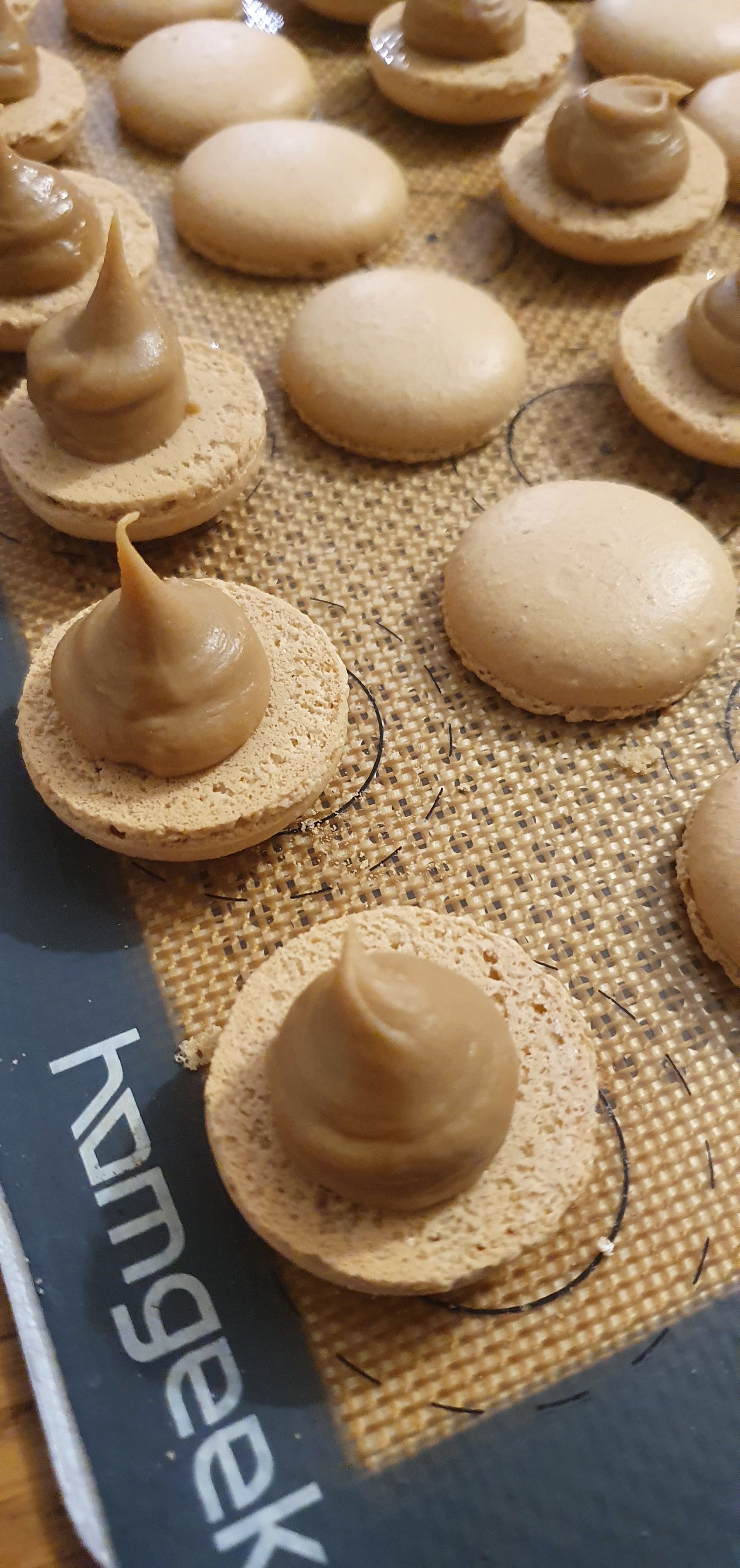 - On remplie une poche à douille avec la ganache et on garnit les macarons: on détend la ganache avant de remplir la poche (on la chauffe très légèrement si elle est trop prise).