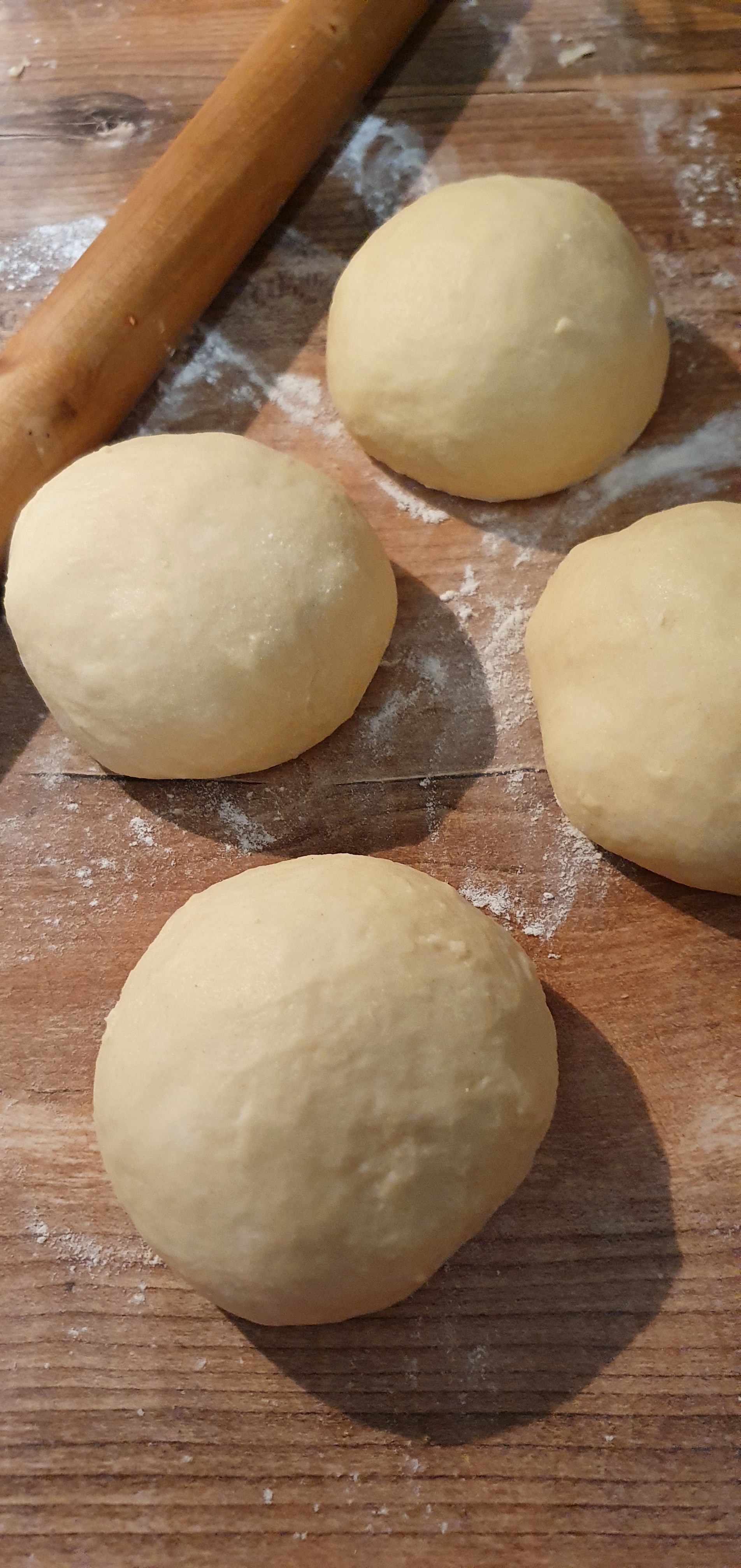 - Quand la pâte a doublé de volume, on la dégaze et on divise en 4 pâtons de poids égale.