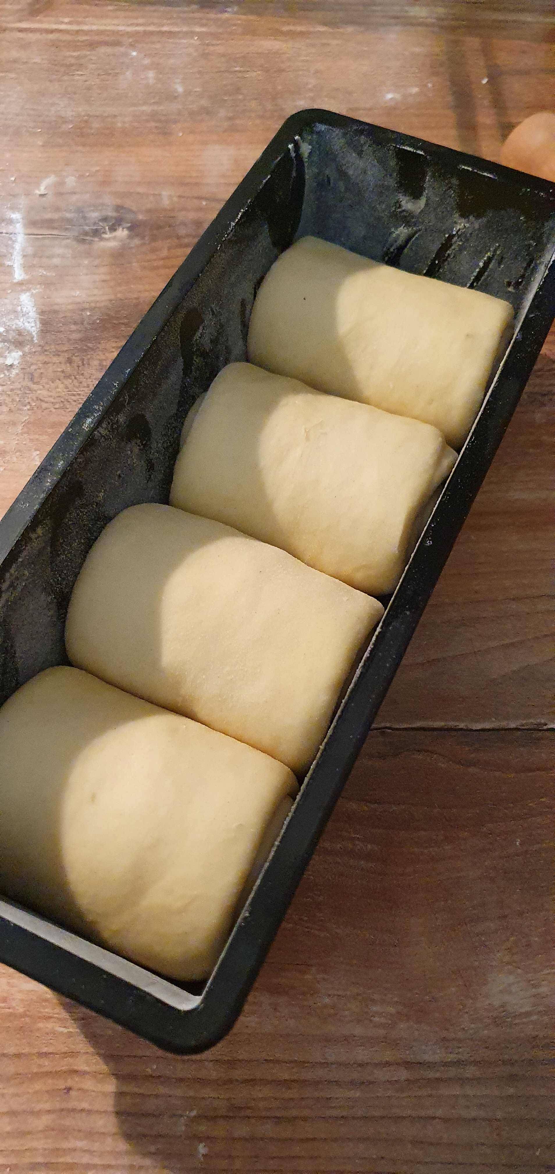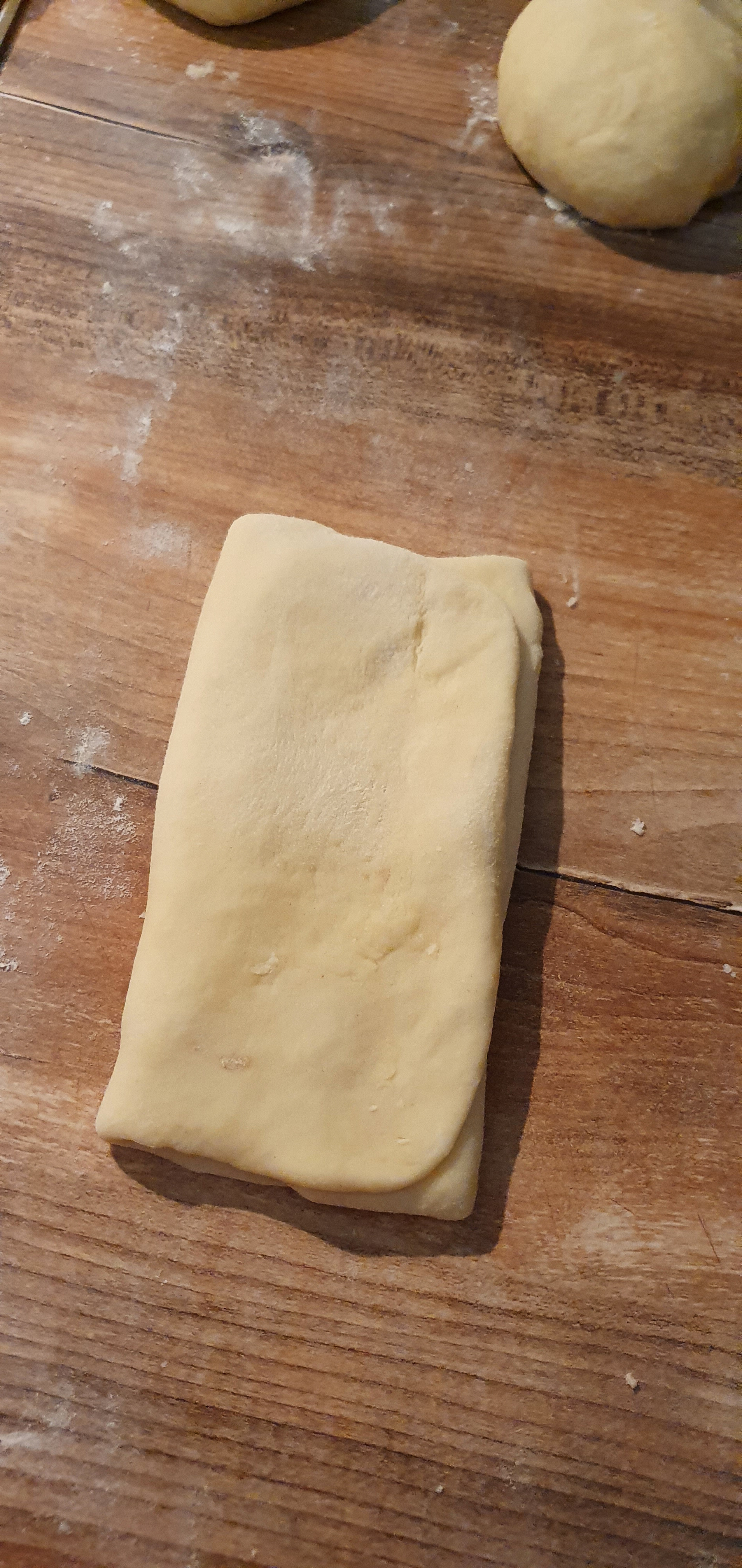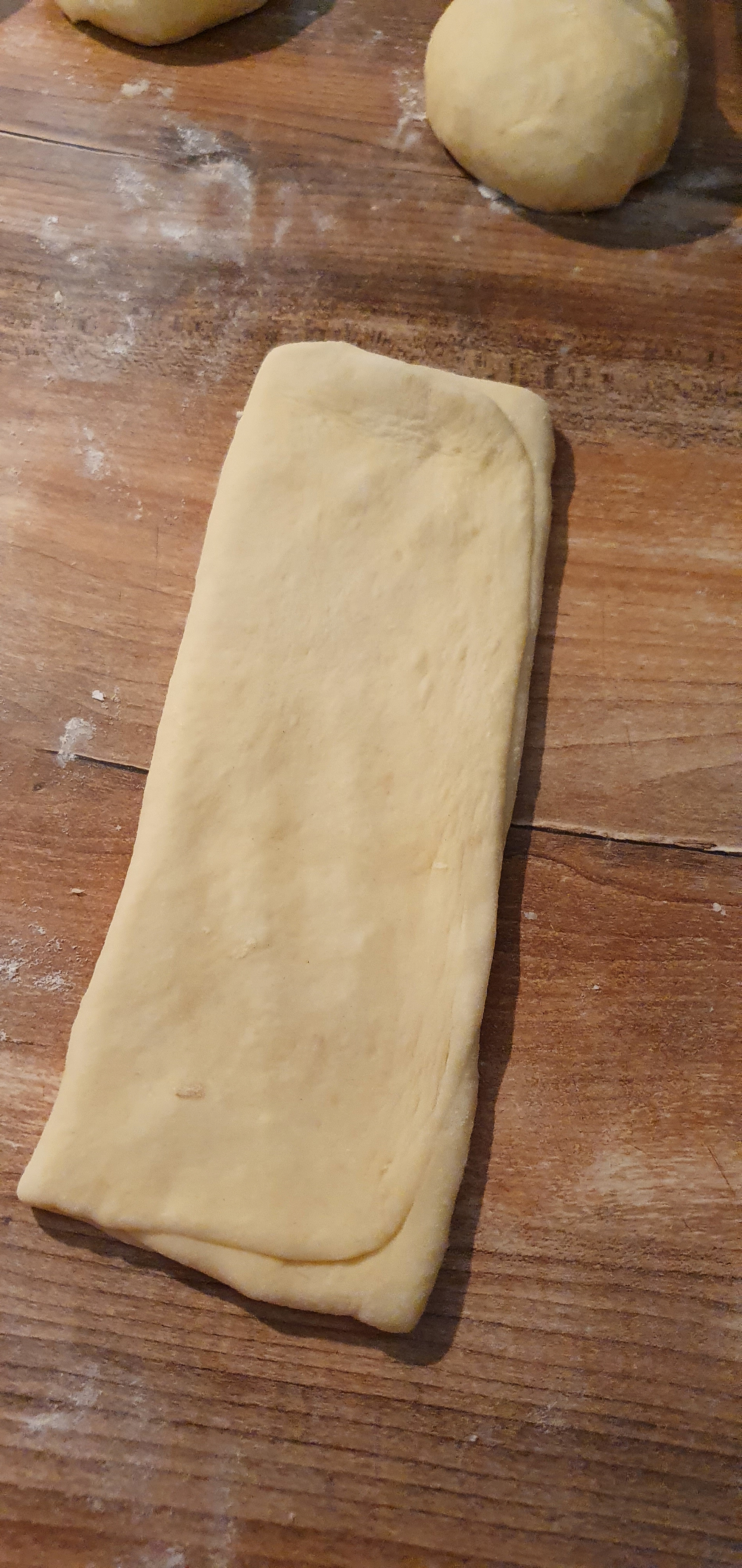 - Sur un plan de travail fariné, on étale au rouleau (je farine les pâtons pour qu’il ne colle pas) chaque pâton pour obtenir une forme rectangulaire. On rabat le haut et le bas, on retourne d’un quart de tour et on étale sur la longueur. On enroule et on dépose le pâton dans le moule beurré et farine (ou chemisé de papier cuisson).
