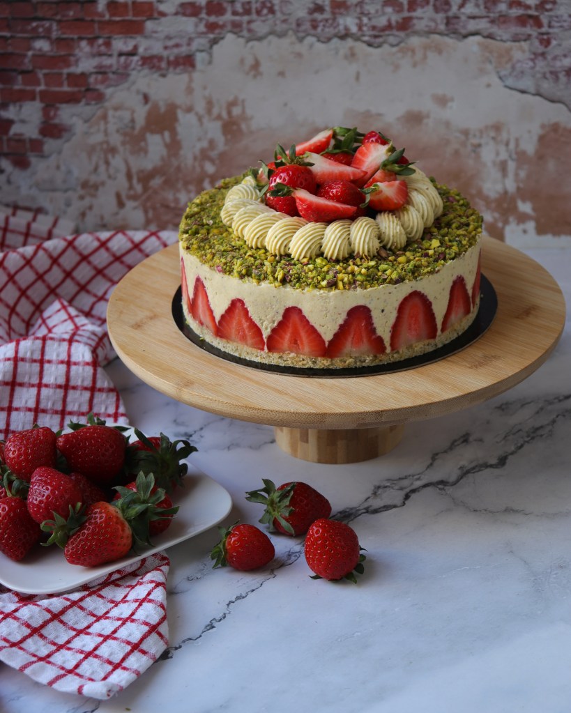 - On couvre le dessus de pistaches grossièrement haché et je termine la décoration en pochant de la crème mousseline et des fraises.
