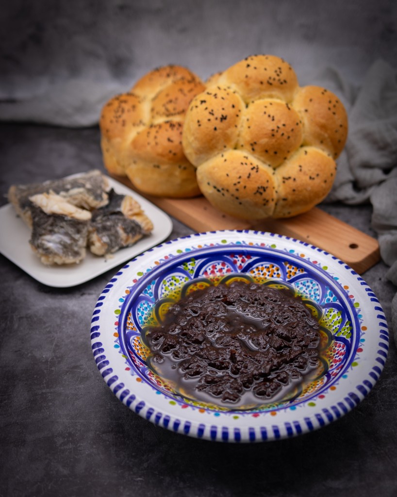 On la mange avec un pain de semoule le pain de l’Aïd. Et Surtout accompagné de Moru séché.
