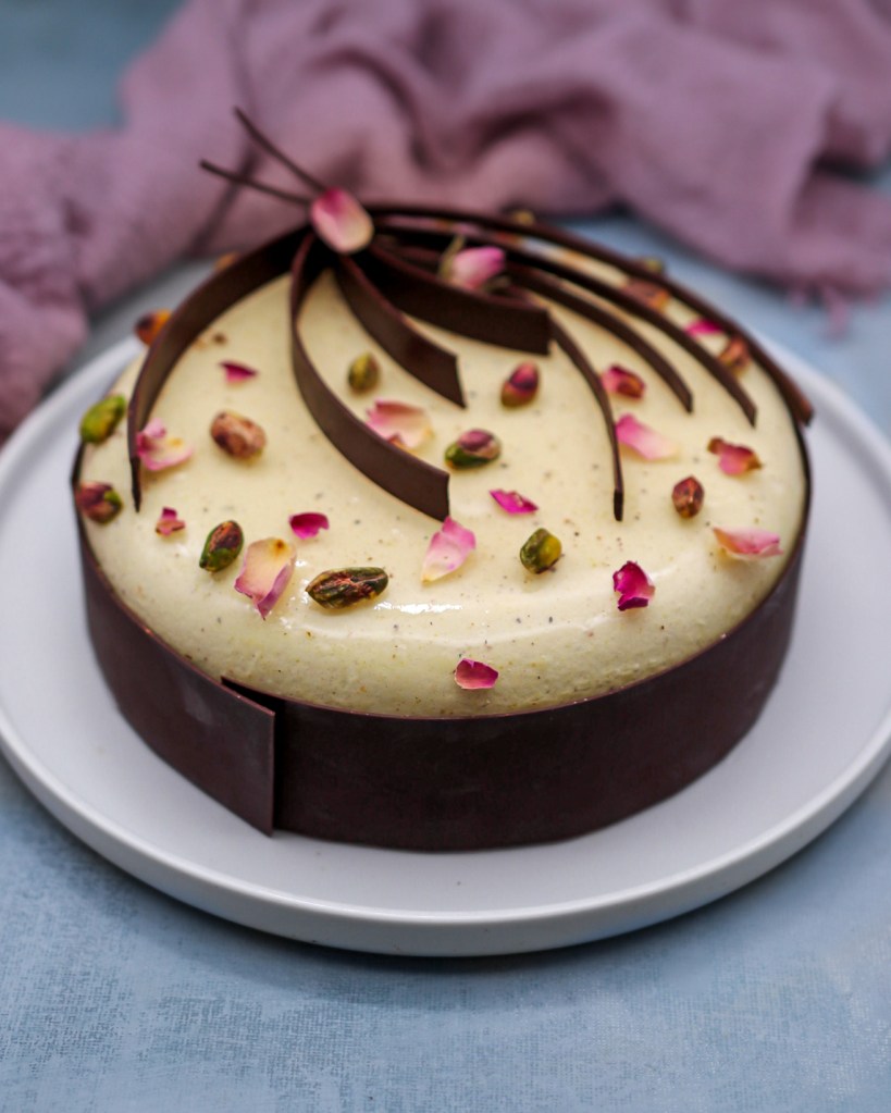 - Ajoutez un cerclage en chocolat et des décors en chocolat et des pistaches