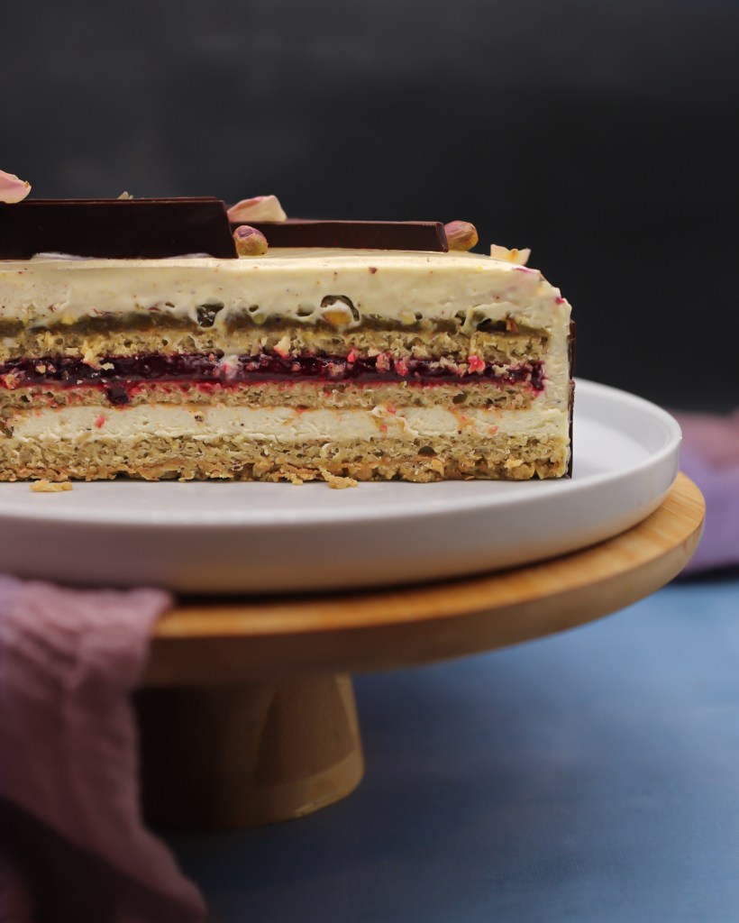 Côté composition: 3 couches de biscuits jocondes, une compoté de framboises, une couche de pâte pistache, un croustillant praliné pistache chocolat blanc et une mousse pistaches qui enveloppe le tout.
