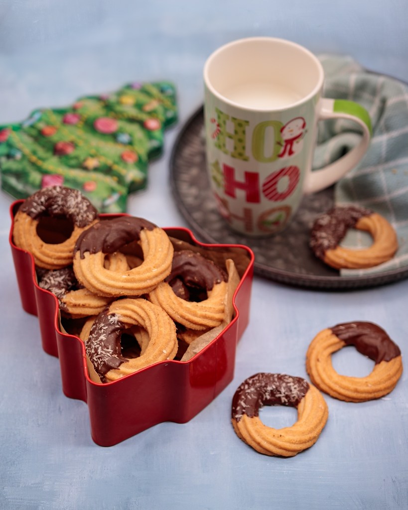 - Mettez la pâte dans une poche à douille (j’ai utilisé une douille cannelé à 8 dents ) et pochez des cercle de biscuits de la taille que vous voulez.