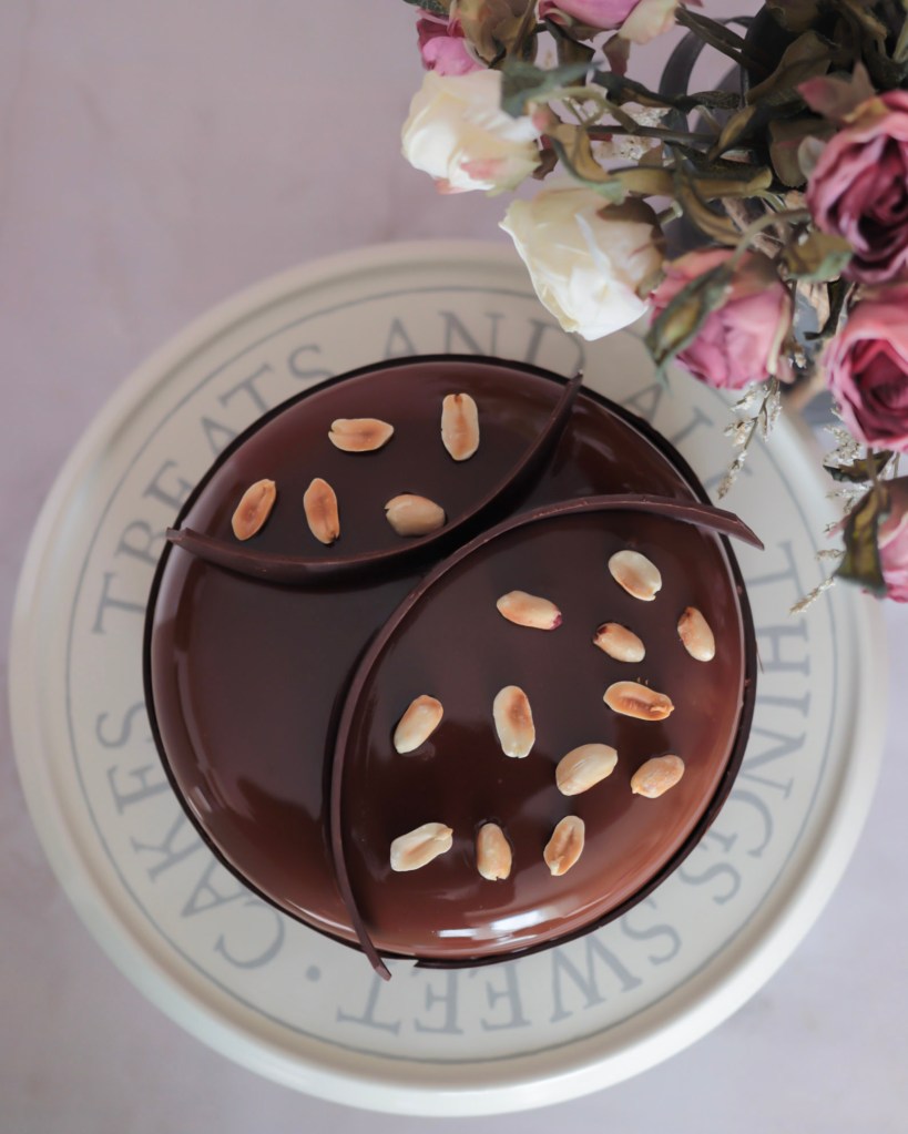 - J’ai opté pour une décoration avec quelques cacahuètes et du chocolat tempéré (cerclage et formes)