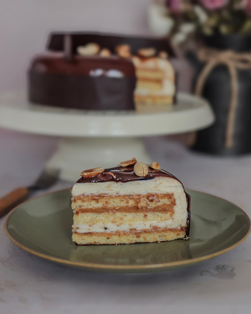 Ma première pensé quand j’ai cet entremet est le goût d’une barre chocolaté. Vous voyez de ce que je parle. Pour éviter de faire un gâteaux trop sucré j’ai viré le caramel. Je garde donc le chocolat pour le glaçage, les cacahuète sous forme de beurre de cacahuète. Pour la vanille, une belle mousse chocolat blanc vanille.