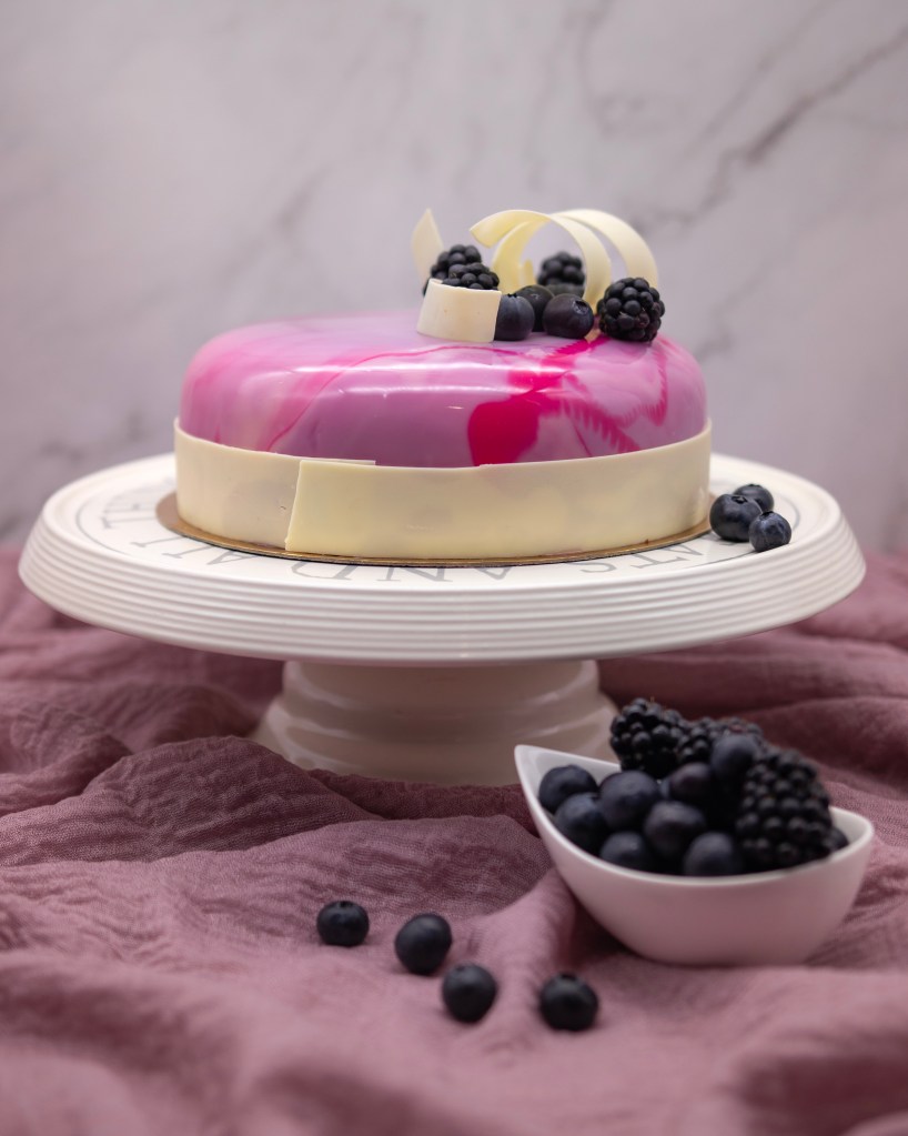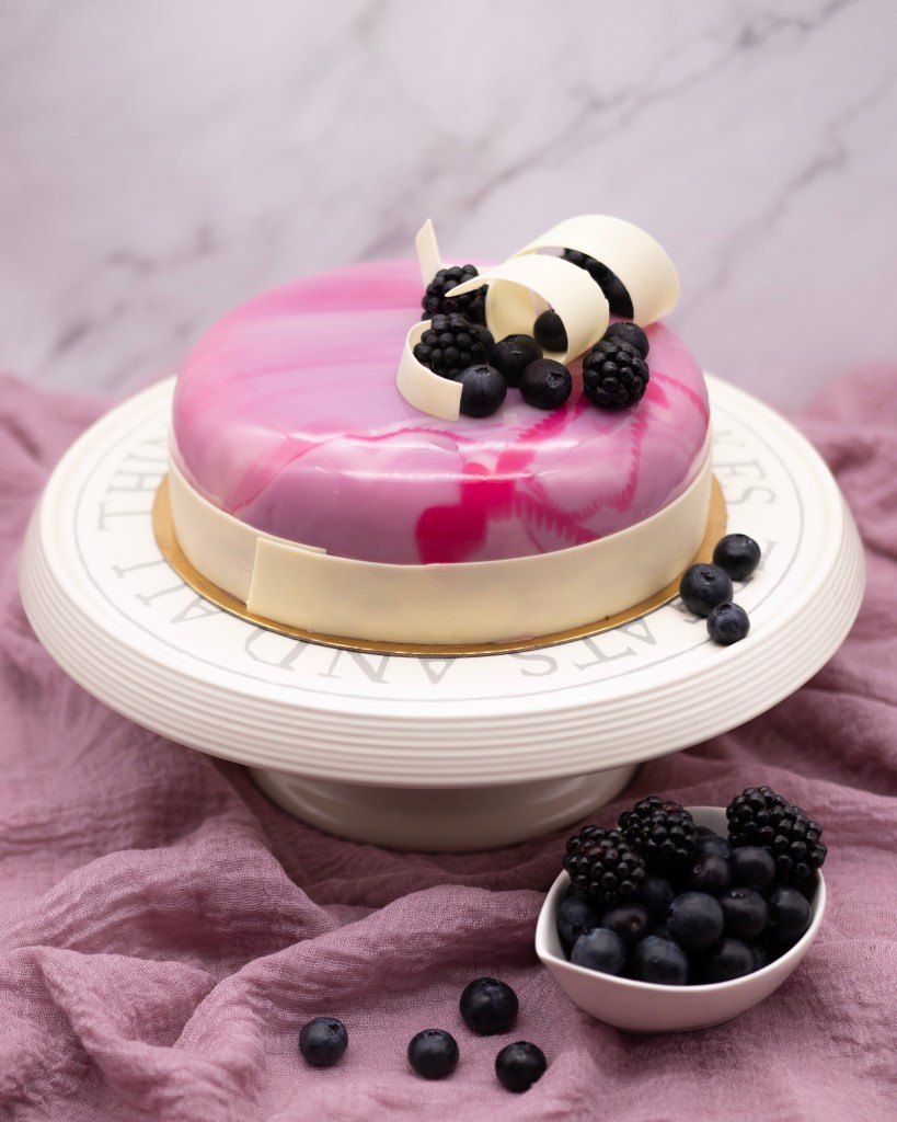 - J’ai opté pour du chocolat tempéré (cerclage et formes) et quelques myrtilles.