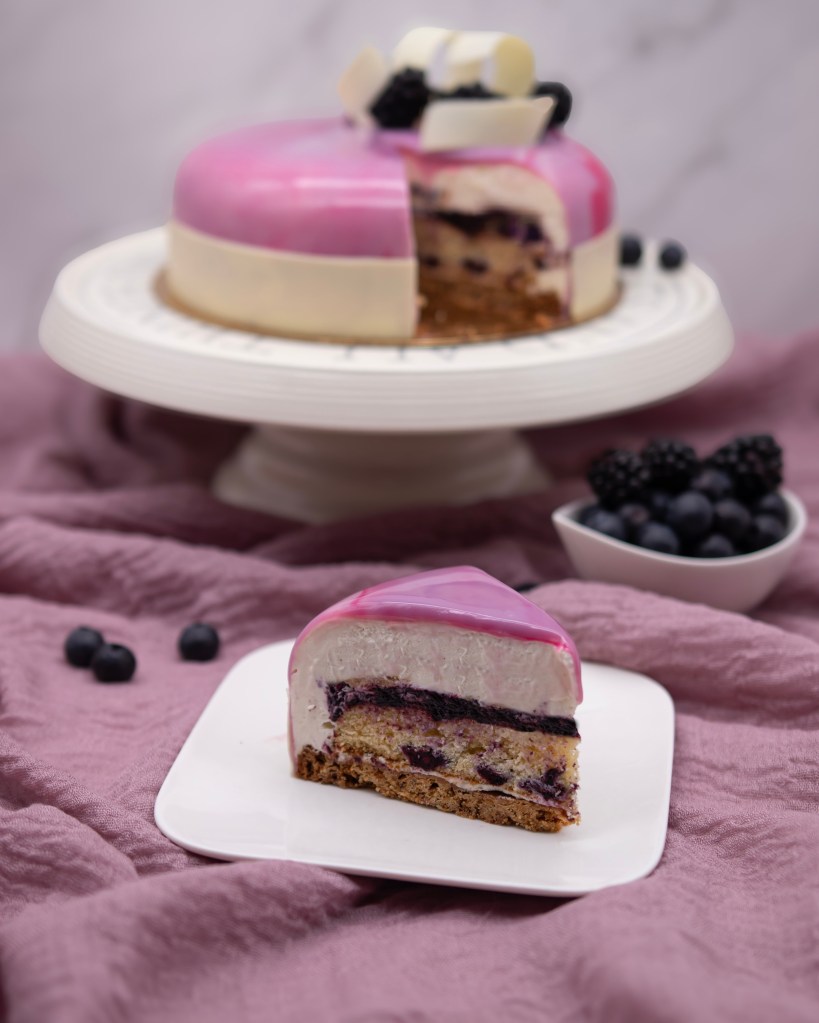 Avec les beau jour, on commence à voir les fruits sur étales des marchés. Ici j’ai choisit d’utiliser les myrtilles: un peu acide, un peu sucrée. J’adore leurs goût subtil. Comme biscuit j’ai choisi de préparer, chose rare dans un entremet il faut dire mais très délicieux, un biscuit madeleine aux myrtille. Pour envelopper le tout une bonne ganache monté vanille. Pour le croquant, j’ai préparé un streusel noisette.